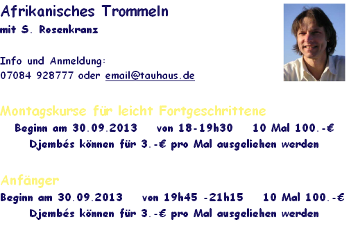 In den angebotenen Kursen machen wir uns vertraut mit der Spieltechnik dieser Instrumente und den traditionellen Malinké-rhythmen. Beim Anfängerkurs werden keinerlei Grundkenntnisse vorausgesetzt - es reicht völlig, wenn Du Lust aufs Trommeln mitbringst.